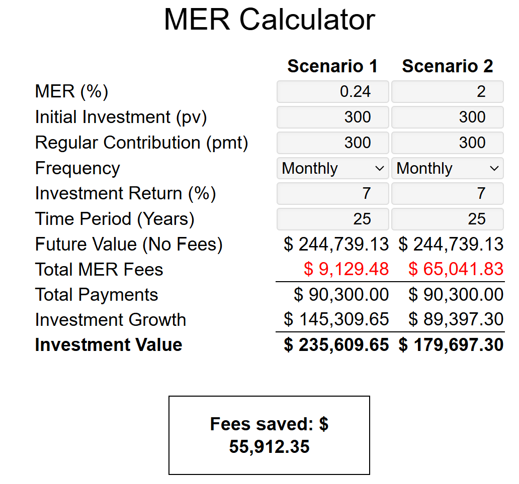 На базата на 20+, които съм разгледала лично [защото няма информационен документ, който е свободно достъпен онлайн да се провери], обикновено тези продукти инвестират 50% в MSCI World и 50% в MSCI Emerging Markets – индексни фондове, които всеки може да купи самостоятелно с ниски разходи. Въпреки това, застрахователите налагат годишна такса за управление от около 2% [може да намалее при по-големи месечни вноски, но масата хора са в тази категория], което е изключително високо за пасивно управлявани инвестиции. За сравнение, ако инвестирате директно в тези индекси чрез ETF-и в тези % [50%/50%], таксите ще бъдат малко под 0.2% годишно. Разлика от над 10 пъти. И преди да си кажете, но 2 процента не са толкова много. Говорим за 2% на година. Ако за период от 25 години сравним каква е разликата между такса от 2% на година и 0.2% на година, при 300 лева давани всеки месец [и тук игнорирам всички други административни такси и натоварване, които инвестиционната застраховка има], разликата е над 55 000.